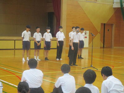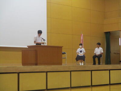 表彰に引き続き、1学期終業式を行いました。最初に、代表生徒による「1学期を振り返って」の発表がありました。1年生は山田翔塁さん、2年生は竹田千紘さん、3年生は宮﨑蒼大さんがそれぞれ1学期の反省や2学期に向けての思いを発表してくれました。