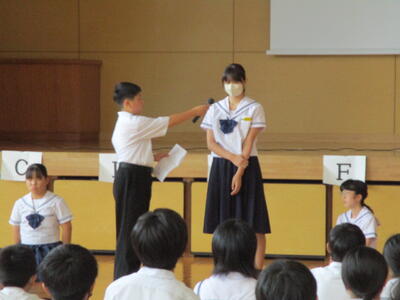 表彰では、バドミントン部男子団体において、城南大会で準優勝、八代中体連総体で優勝しました。個人戦において、男子シングルスや男子ダブルス、女子ダブルスで3位までの生徒を表彰しました。また、サッカー部も八代中体連総体で3位入賞で表彰しました。