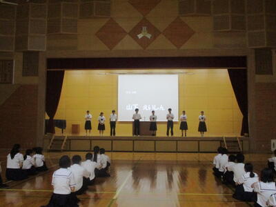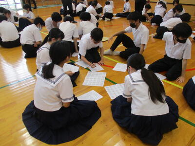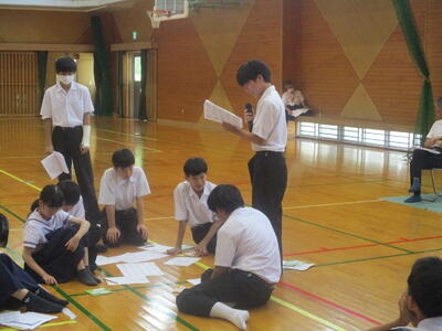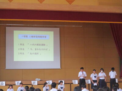 7月16日に6月のいじめ根絶月間の取組を振り返り、各学年での人権部落問題学習の学びを全校生徒で共有する目的で人権集会を実施しました。人権委員長である小林倭雄さんの挨拶のあと、いじめ根絶に向けての標語発表、各学年代表者による人権部落問題学習の紹介と感想発表を行いました。集会の後半は、学年を縦割りグループにしてワークショップを実施しました。今年は、「子どもの権利条約」をテーマに、ユニセフから出ている資料を基に、子どもの権利条約とはどういうものか確認し、グループ毎に意見交流を行い、出てきた意見を発表しました。この「子どもの権利条約」については、2学期以降の人権集会でも継続して取り上げ、学びを深めていく予定にしています。