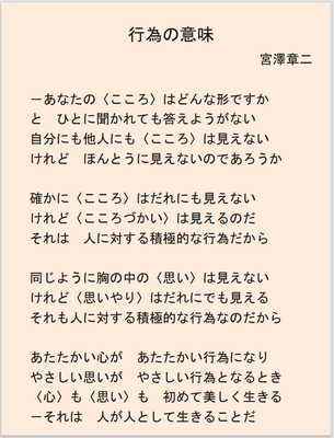 集会の最後に、校長の話として、2011年の東日本大震災が発生した後、テレビのスポンサーCMの代わりに毎日流れていた、ACジャパン制作のメッセージ性のあるCM動画と、そのCMの基になった詩人の宮澤章二さんの「行為の意味」という文章を紹介しました。人権問題について考える上で大事なことは何かを感じて、八中で学ぶ生徒として「思いをカタチに」できる人になってもらいたいと願っています。