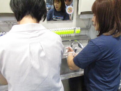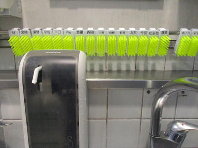 また、最初に行う手洗いも調理員さんそれぞれに自分の名前の入った専用ブラシがあり、マニュアルにそって何分も掛けて手の洗浄を行っているとのことでした。