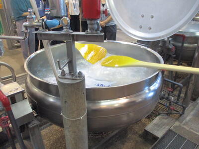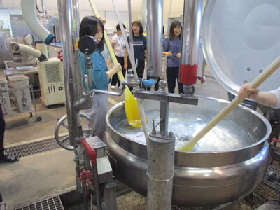 次に、大きな釜で調理する疑似体験がありました。ボートのオールのような大きなしゃもじで、具材を混ぜる作業はとても大変で、麻婆豆腐など調理するときは全身を使わないと混ぜることはできない重労働とのことでした。