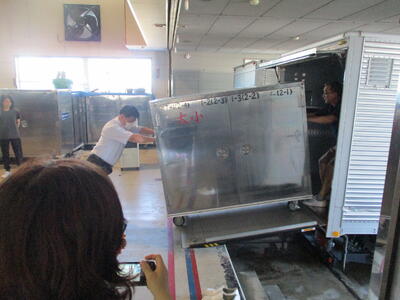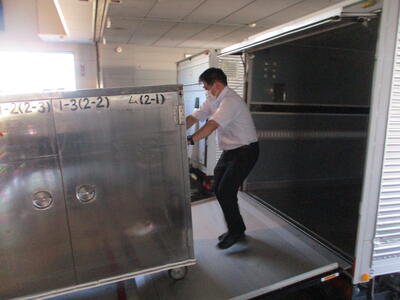 できあがった給食はコンテナに入れられ、トラックに積み込む作業になります。本校の上野先生が代表で体験されましたが、とても重たく大人の男性二人でも大変な作業でした。