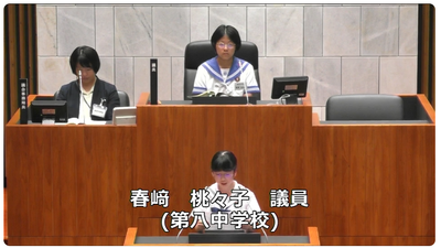 本校からは、3年生の平田虎太郎さんが質問者として、2年生の春﨑桃々子さんが感想等を発表してくれました。質問項目は「古麓歴史自然公園遊歩道の再開発について」として、アスレチック施設等の修繕、遊歩道や広場の修繕、環境に配慮した公園整備について質問を行いました。その回答として、アスレチック施設については利用者の減少や施設の老朽化により平成12年に廃止され、遊歩道周辺が古麓城跡として平成26年に国指定の史跡に指定された現在、文化財保護の観点から現状を大きく変更することが困難であるため、新たに整備する計画はないと市長から答弁がありました。一方で、古麓城跡を保存し活用するための整備基本計画が策定され、それに基づき遊歩道の段差解消や東屋の改修、樹木の剪定・伐採を行う予定であり、歴史説明看板の設置も併せて、遊歩道の再整備を行う際には、地域住民とワークショップ等を実施しながら、多くの皆様に愛される遊歩道にしていきたいと回答がありました。