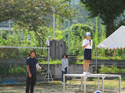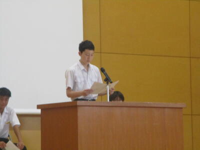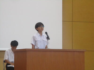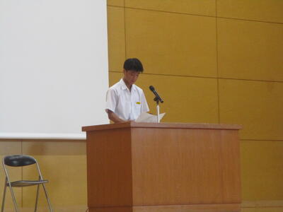 始めに、「2学期の抱負」を各学年代表生徒に発表してもらいました。1年生は吉田弦禄さん、2年生は上田海成さん、3年生は有田拓真さんが、それぞれ勉強のこと、体育大会等の行事のこと、部活動のこと、進路に向けた取組のことなど、堂々と話してくれました。