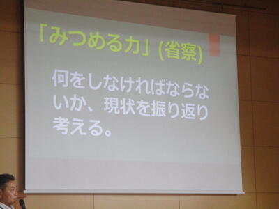 次に、校長先生のお話があり、夏休み期間中大きな怪我や事故等もなく、全員元気に2学期の始業式を迎えられたことを大変うれしく思いますと話されました。そして、8月11日の未明からの豪雨による災害の話をされ、改めて自然災害の恐ろしさと日頃からの災害に対する準備や避難の大切さについて話をされました。その後、2学期は「充実の学期」と言われ、体育大会や文化祭、合唱コンクール、修学旅行と大きな行事が目白押しです。また、学習面でも来週から始まる前期期末考査、3年生の県共通テスト、後期中間考査、熊本県学力調査も控えており、これらの行事やテスト等を通して生徒の皆さんが大きく成長する学期でもありますと話されました。そして、生徒の皆さんに身に付けてほしい3つの力「見つめる力」「みとおす力」「つなげる力」を紹介され、2学期は、この3つの力を育んでいく絶好の機会です、と話されました。