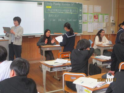 11月17日(月)に、Special English Time(スペシャル・イングリッシュ・タイム)を実施しました。これは、複数のALTに八中に来ていただき、生徒がALTとの交流を通して、これまでの英語学習の中で学んだことを活用し、さらに英語学習への意欲を喚起する目的で行いました。