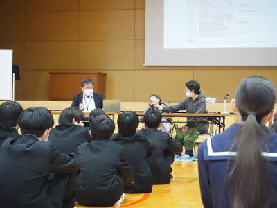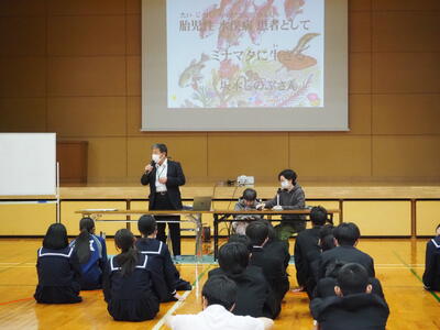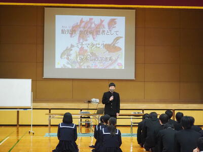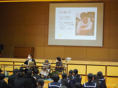 12月17日(水)、人権同和教育講演会を実施しました。これは、水俣病問題について、当事者である坂本しのぶさんの話しを直接お聞きし、水俣病問題を自分の課題として重ね、差別を無くそうとする態度や、身の周りの出来事や暮らしと重ね、人権課題について考え、解決していこうとする態度を育てることを目的に毎年実施しているものです。
