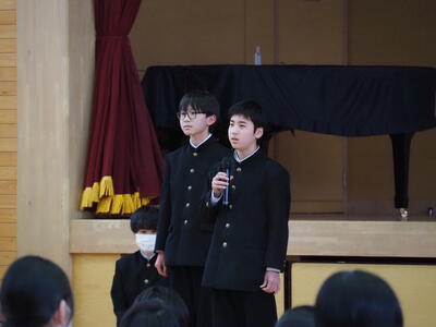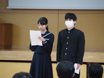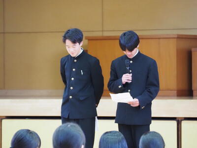 1月19日(月)、全校集会において、令和8年新議長、書記及び専門委員長任命式(引き継ぎ式)を行いました。最初に、旧議長、書記、専門委員長から、一年間の取組についての振り返りと、次に受け継ぐ生徒の紹介と併せて挨拶を行いました。その後、新役員が一人ずつ紹介されステージ前に整列し、校長先生から任命書が手渡され、任命されました。