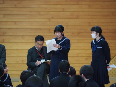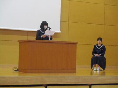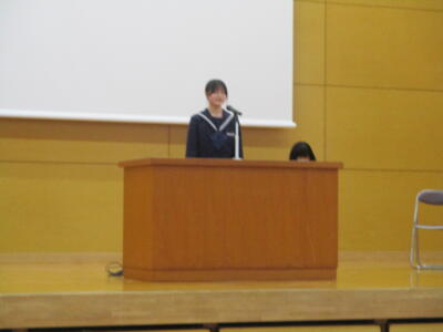 2月24日(火)に3学期校内人権集会を行いました。服部さんの開会に始まり、人権委員長あいさつの中で、春﨑さんが今回の人権集会の内容や思いを発表しました。次に、各学年から3学期の人権学習の取組内容や授業を通しての感想発表がありました。1年生はハンセン病に係る人権問題を、2年生は精肉業に携わる人々の思いを題材にした「いのちをつくる仕事」について、3年生は「DVDめぐみ」の視聴等を通して、拉致被害者問題についての発表でした。