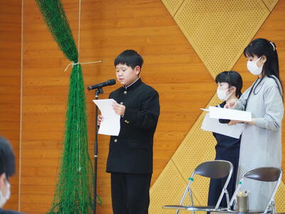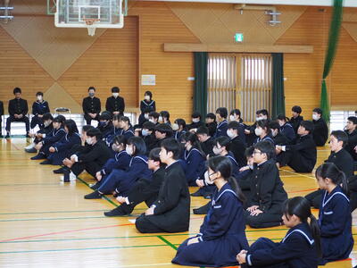 2月6日(金)に2年生立志式を行いました。今の自分を見つめ直し、将来の自分のあるべき姿を想い描き、これからの自分にとってよりよい生き方を考える機会とすること。また、現在の自分の姿や将来において望む生き方など、自分の考えや思いなどを発表することで、自分の言動に責任と自覚を持ち、目標に向かって努力をしていく姿勢を培う目的で実施しました。本来は、龍峯山の五合目まで登山し、そこで決意表明をする予定でしたが、生憎の雨で決意表明のみ本校体育館での実施となりました。