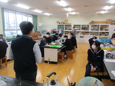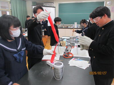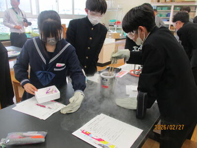 2月27日(金)、2年生理科の授業で八代高専との連携授業を行いました。八代高専からリベラルアーツ系理数Grの東田洋次教授、生物化学システム工学科の吉永圭介准教授を講師としてお招きし開催しました。今回のテーマは「液体窒素を利用した状態変化と超伝導」と題し、たくさんの実験を行いました。