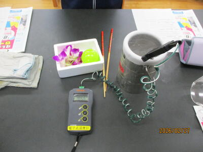 最初に、液体窒素についての学習を行い液体窒素の温度を測定すると、なんとマイナス196℃前後でした。次に、液体窒素が入った容器に蘭の仲間の花やカラーボール、膨らませた風船を入れてみました。花びらはカチカチに固まり、上から落とすとガラス細工のように粉々に砕けました。カラーボールも床に投げつけると、こちらも跳ねずに割れてしまいました。風船は、液体窒素に入れるとどんどんしぼみ、外に出すとまた元のように膨らみました。
