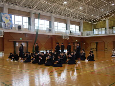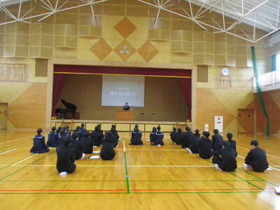 3月25日(水)、第1学年及び第2学年の修了式を実施しました。修了式の前にまず表彰式を行いました。部活動の大会や美術作品、作文、標語など多くの生徒が表彰を受けました。修了式では「一年間を振り返って」と題して代表生徒2人の発表がありました。1年代表の久木田さんは、「この一年間で自分自身が成長したと思うことがたくさんありました。2年生になったら、後輩に優しくアドバイスができるようになりたい」と発表してくれました。2年代表の木村さんは、「今年一年間で心に残っている思い出は、職場体験と体育大会でした。3年生になると受験勉強など大変になると思いますが、一つ一つの行事を大切にしていきたい」と発表してくれました。