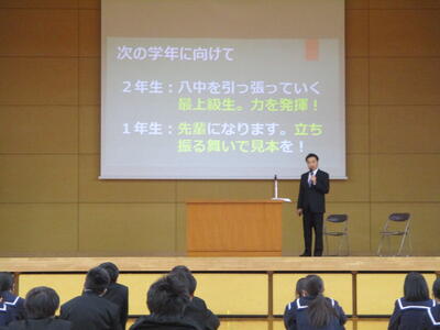 その後、1年の吉田さん、2年の森下さんそれぞれに、学年代表として修了証が手渡されました。最後に、校長先生から修了式を迎えるにあたって話があり、この一年間皆さんが頑張っている姿をたくさん見ることができました。また、本当に成長したと思いますと話されました。そして、4月から学年が1つずつ上がります。2年生は八中を引っ張っていく最上級生となります。2年生のもっているとてつもないエネルギーとパワーを発揮してほしいこと、1年生はいよいよ先輩になります。新入生にあたなたちの立ち振る舞いで見本を見せてほしいと期待を込めて話がありました。