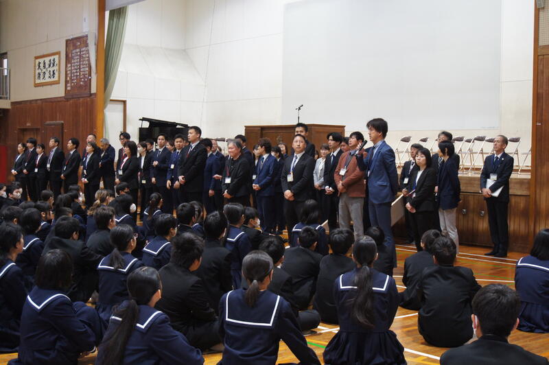 3月25日(水)の11時から退任式を体育館で行いました。今年度の退職及び転出者は17名で、そのうち13名が退任式に参加しました。教頭先生が退職及び転出者の紹介を行った後、退任者は壇上で挨拶しました。その後、生徒代表の挨拶をし、花束贈呈がありました。退任される先生方、お世話になりました。次のステージでのご活躍を期待しています。