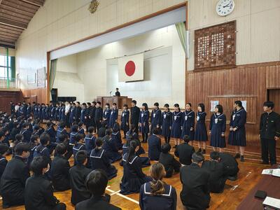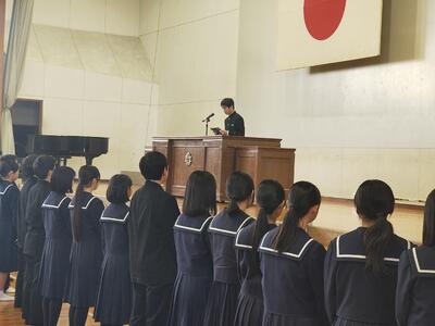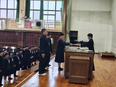 12月23日(水)の5時間目に、生徒会本部役員・専門委員長・副委員長新旧交代式を行いました。