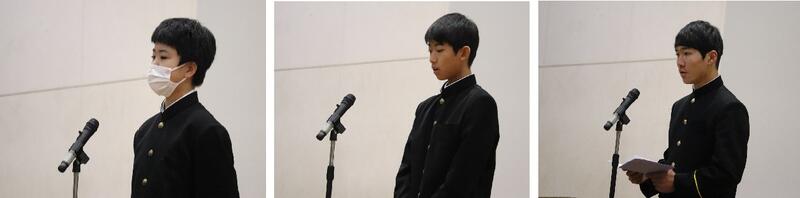 12月25日(水)に2学期終業式を行いました。終業式の前に、9月~12月までに受賞した生徒への表彰式を行いました。表彰者一覧をPDFにしておりますので、詳細はそちらでご確認ください。終業式では、1年生は3組の岩本光生さん、2年生が3組の平山颯祐さん、3年生は2組の中野来夢さんが学年代表として2学期の振り返りを行いました。また、保健室の阪口富美子先生の退任式を行いました。阪口先生は、病気でお休みされている浦底先生の代替で勤務いただいていましたが、1月から浦底先生が復帰されるため、ご退職されることになりました。約1年、献身的にお勤めいただきありがとうございました。