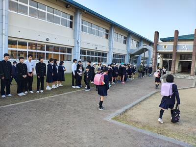 11月21日(金)の7時40分~8時の登校時間に、一中生とが松高小、八代小、代陽小の3校に出向いて朝のあいさつ運動を行いました。これは、一中校区の幼・小・中で組織している「六校園」の活動の一環で、毎年、この時期に行っています。八代小学校では一中生が約50人参加し、小学生と一緒に元気な挨拶を行いました。小学校の頃お世話になった先生と会うこともでき、参加した生徒は充実した時間を過ごすことができたようです。