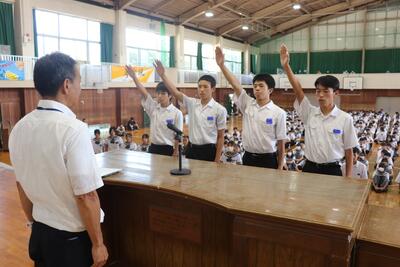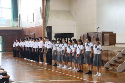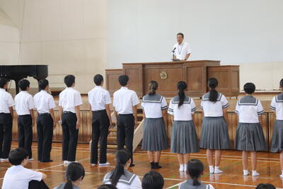 10月16日(木)、県立八代運動公園で「八代中体連駅伝競走大会」が行われるのを前に、15日(水)の5時間目を利用して「結団式」を行いました。結団式では、3年生男子4名が代表して選手宣誓を行い、生徒を代表し、久保さんが励ましのメッセージを送りました。明日は、女子のスタートが10時、男子のスタートが11時20分となっています。県大会への出場枠は、男女とも2枠となっています。天草で行われる県大会への出場を目指して、襷をしっかりとつなげていってください。