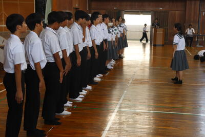 八代第四中学校の3部活動で、拠点校部活動がスタートしました。「男子バレーボール部」と「女子バレーボール部」と「相撲」の3競技です。『拠点校部活動』は、自分の学校に部活動がない場合、他校の部活動に入部できる制度で、今後、一中でも実施していく方向です。バレーボールについては、本校に部活動がありますので四中に入部することはできません。相撲は、四中以外、相撲部がありませんので、八代市全域から入部が可能となっています。入部できるのは1~2年生です。「相撲部への入部を考えている」あるいは「もう少し詳しく知りたい」人は、担任の先生に知らせてください。詳しい資料をお渡しします。
