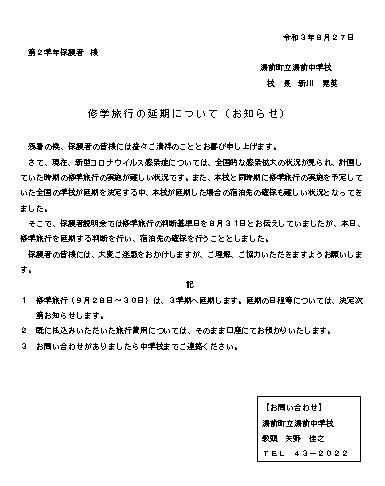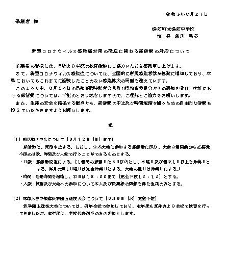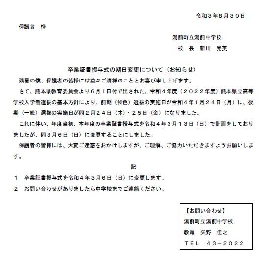 お知らせ 全ての記事 全ての記事 カテゴリ アーカイブ 2025年12月 (0) 2025年11月 (0) 2025年10月 (0) 2025年9月 (0) 2025年8月 (0) 2025年7月 (0) 2025年6月 (0) 2025年5月 (0) 2025年4月 (0) 2025年3月 (0) 2025年2月 (0) 2025年1月 (0) 2024年12月 (0) 2024年11月 (0) 2024年10月 (0) 2024年9月 (0) 2024年8月 (0) 2024年7月 (0) 2024年6月 (0) 2024年5月 (0) 2024年4月 (0) 2024年3月 (0) 2024年2月 (0) 2024年1月 (0) 2023年12月 (0) 2023年11月 (0) 2023年10月 (0) 2023年9月 (0) 2023年8月 (0) 2023年7月 (0) 2023年6月 (0) 2023年5月 (2) 2023年4月 (2) 2023年3月 (0) 2023年2月 (0) 2023年1月 (2) 2022年12月 (0) 2022年11月 (4) 2022年10月 (0) 2022年9月 (2) 2022年8月 (1) 2022年7月 (1) 2022年6月 (1) 2022年5月 (1) 2022年4月 (3) 2022年3月 (2) 2022年2月 (1) 2022年1月 (4) 2021年12月 (0) 2021年11月 (0) 2021年10月 (1) 2021年9月 (4) 2021年8月 (3) 2021年7月 (0) 2021年6月 (0) 2021年5月 (7) 100件 1件 5件 10件 20件 50件 100件 (5月14日)体育大会プログラム 投稿日時 : 2023/05/13 管理者 5月14日の体育大会は、開催します。グラウンドコンディションの回復のため、13:00開会とします。 体育大会プログラム(表紙).pdf 体育大会プログラム(変更日程).pdf (5月9日)新型コロナウイルス感染症対策について 投稿日時 : 2023/05/09 管理者 050509 新型コロナウイルス感染症対策について.pdf (4月17日)体育大会開催について 投稿日時 : 2023/04/17 管理者 20230417 体育大会開催について.pdf 学校と家庭を繋ぐメールシステムの構築 投稿日時 : 2023/04/01 管理者 令和5年度から、学校からのお知らせは以下のとおり送信します。 (1月24日)学級閉鎖について 投稿日時 : 2023/01/24 管理者 学年閉鎖について.pdf (1月23日)積雪に伴う学校の対応について 投稿日時 : 2023/01/23 管理者 積雪に伴う学校の対応について.pdf (11月21日)ロードレース・駅伝大会及び学年PTAについて 投稿日時 : 2022/11/21 管理者 ロードレース・駅伝大会及び学年PTAについて.pdf (11月2日)伝統芸能継承活動発表における衣装着付け協力について 投稿日時 : 2022/11/02 管理者 伝統芸能継承活動発表における衣装着付け協力について.pdf (11月2日)里宮神社大祭奉納参加について 投稿日時 : 2022/11/02 管理者 里宮神社大祭奉納参加について.pdf (10月31日)令和4年度湯前中学校「文化祭」について 投稿日時 : 2022/11/02 管理者 令和4年度湯前中学校「文化祭」について.pdf (9月5日)台風11号に伴う学校の対応について(続報) 投稿日時 : 2022/09/05 管理者 040905 台風11号に伴う学校の対応について(続報).pdf (9月2日)台風11号に伴う学校の対応について 投稿日時 : 2022/09/02 管理者 040902 台風11号に伴う学校の対応について.pdf (8月29日)新型コロナウイルス感染症の感染拡大防止対策の徹底について 投稿日時 : 2022/08/29 管理者 040829 新型コロナウイルス感染症の感染拡大防止対策の徹底について.pdf (7月19日)夏季休業中における新型コロナウイルス感染症の感染防止対策について 投稿日時 : 2022/07/19 管理者 040719 新型コロナウイルス感染症の感染防止対策について.pdf (6月1日)緊急時の登下校の対応について 投稿日時 : 2022/06/01 管理者 040601 緊急時の登下校の対応について.pdf (5月13日)新型コロナウイルス感染症の感染拡大防止について 投稿日時 : 2022/05/13 管理者 040513 新型コロナウイルス感染症の感染拡大防止について.pdf 4/26 PTA合同委員会について 投稿日時 : 2022/04/25 管理者 R4 運営・専門・地区合同委員会.pdf (4月13日)熱中症をはじめとする健康管理について 投稿日時 : 2022/04/13 管理者 040413 熱中症をはじめとする健康管理について.pdf (4月12日)新型コロナウイルス感染症感染拡大防止の対策について 投稿日時 : 2022/04/12 管理者 040412 新型コロナウイルス感染症感染拡大防止の対策について.pdf (3月23日)まん延防止等重点措置解除に伴う新型コロナウイルス感染症感染拡大防止の対策について 投稿日時 : 2022/03/23 管理者 040323 まん延防止等重点措置解除に伴う新型コロナウイルス感染症感染拡大防止の対策について.pdf (3月7日)まん延防止等重点措置適用の期限延長に伴う新型コロナウイルス感染症感染拡大防止の対策の徹底について 投稿日時 : 2022/03/07 管理者 040307 まん延防止等重点措置適用の期限延長に伴う新型コロナウイルス感染症感染拡大防止の対策の徹底について.pdf (2月14日)まん延防止等重点措置適用の期限延長に伴う新型コロナウイルス感染症感染拡大防止の対策の徹底について 投稿日時 : 2022/02/14 管理者 040214 まん延防止等重点措置適用の期限延長に伴う新型コロナウイルス感染症感染拡大防止の対策の徹底について.pdf (1月28日)非常災害時の安否確認テストの実施について(お願い) 投稿日時 : 2022/01/28 管理者 非常災害時の安否確認テストの実施について.pdf (1月28日)県の感染リスクレベル引き上げに伴う部活動の対応について 投稿日時 : 2022/01/28 管理者 県の感染リスクレベル引き上げに伴う部活動の対応について.pdf (1月21日)まん延防止等重点措置適用等に伴う新型コロナウイルス感染症感染拡大防止の対策の徹底について 投稿日時 : 2022/01/21 管理者 まん延防止等重点措置適用等に伴う新型コロナウイルス感染症感染拡大防止の対