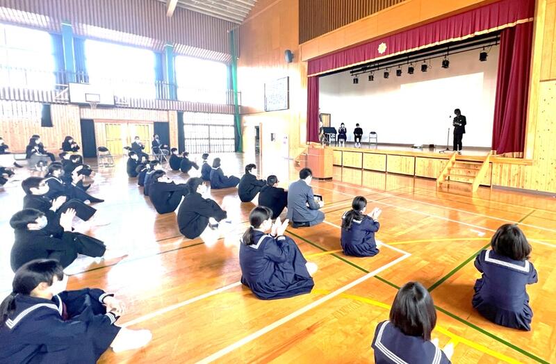 まん延防止等重点措置適用期間のため、放送室からリモート配信となりましたが、湯前小5・6年生と湯前中全員は、先生のお話にしっかり聞き入っていました。
