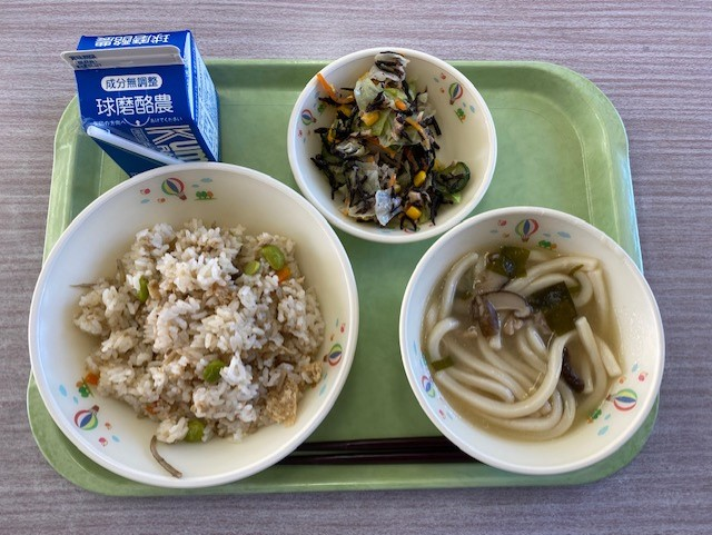 こぎつねごはんは、全国各地で作られている給食の人気メニューです。小さく三角に切った油揚げがこぎつねの耳に似ていたので、「こぎつねごはん」と呼ばれているそうです。