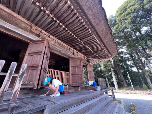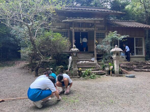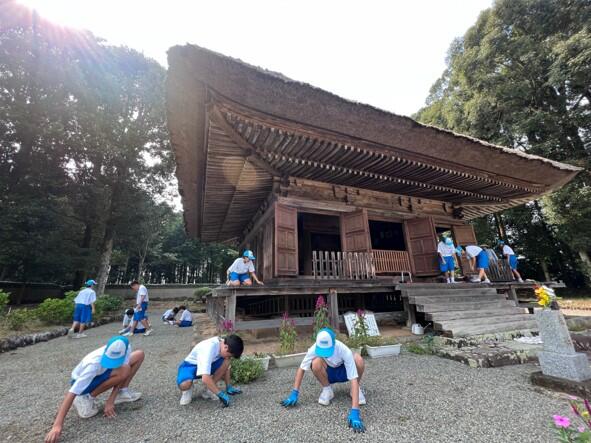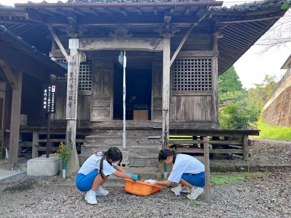 先日、「里宮神社」と「高齢者生活福祉センター湯愛」の除草活動を行った1年生。今回は、「宝陀寺」「城泉寺」「普門寺観音堂」で地域の方と一緒に清掃作業を行いました。