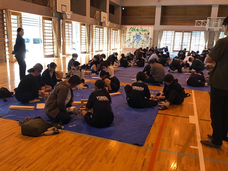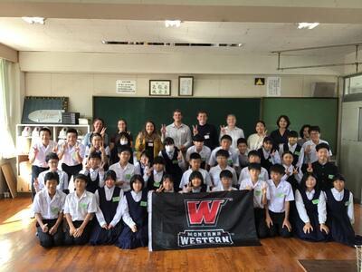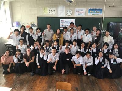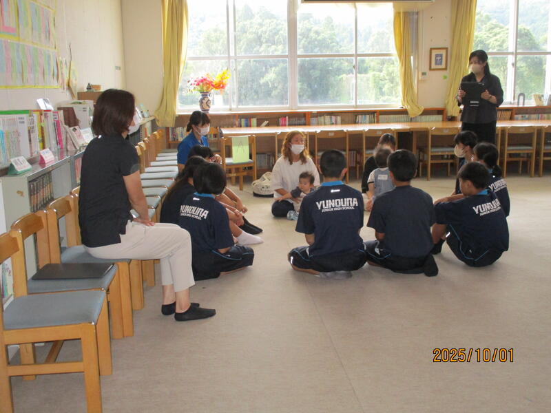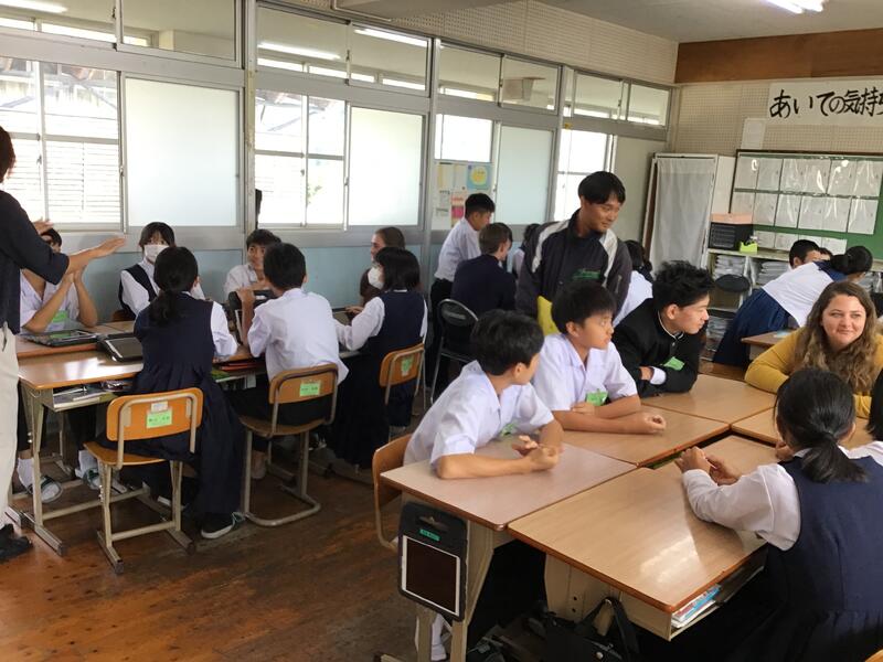 アメリカのモンタナ州から熊本に来ていた学生と湯浦中学校の生徒の交流がありました。