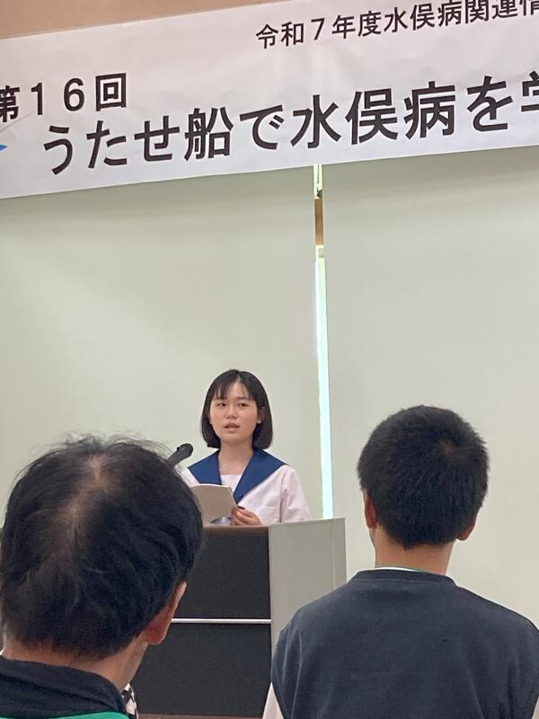 9月27日「第16回うたせ船で水俣病を学ぶ講座」において葦北町内の中学校3校からそれぞれの代表が作文の発表をした。湯浦中学校からは、3年生の入江さんが「本当の水俣」と題し発表した。