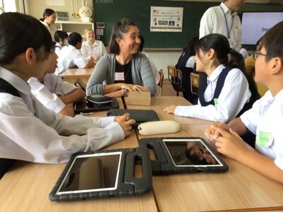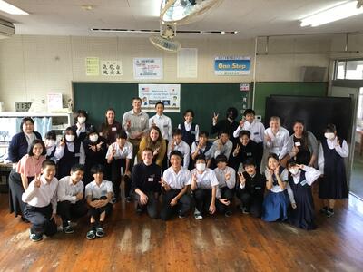 1・2年生の学級で、それぞれの班に入り、英語でお互いの地域の紹介をしたり、いろんなことを質問したりして楽しい時間を過ごすことができました。