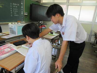 3年生が自分たちで問題を作り、わからなくて悩んでいる後輩に個別に教えています。