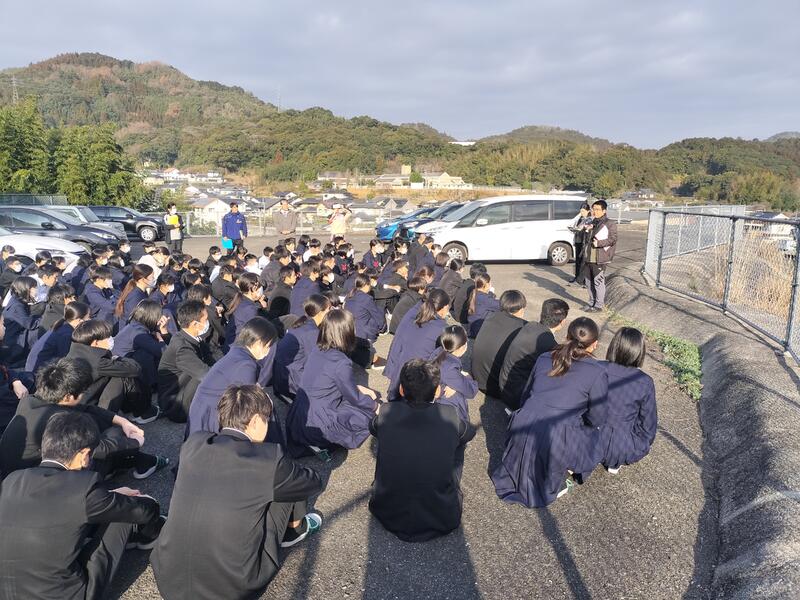 理科室で火事が起こったという設定です。校舎裏の駐車場に避難しました。