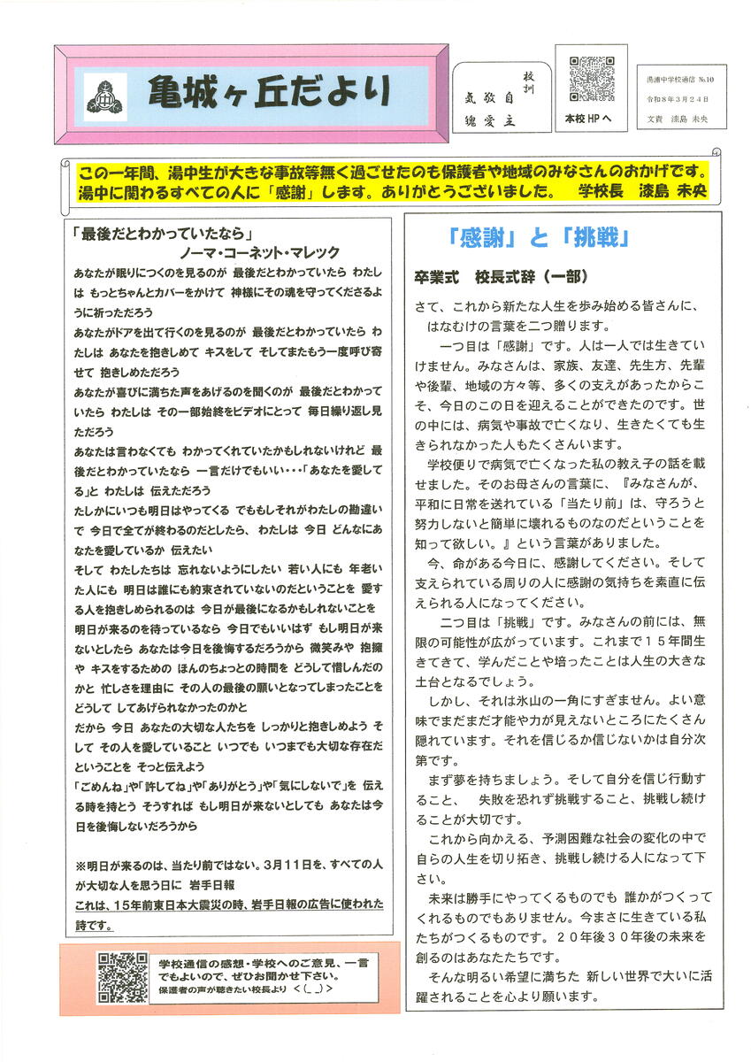 亀城ヶ丘だより(湯浦中学校通信№.10)