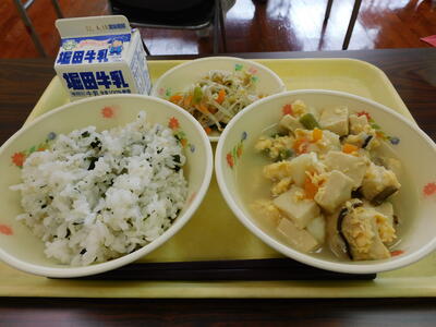 牛乳 わかめご飯 もやしのごま和え 親子煮